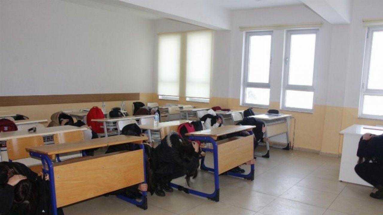 Sirenlerin çalması ile birlikte saniyelerle yarışan öğrenciler sınıflarda bulunan sıraların altına saklanıp kısa zamanda okulun bahçesindeki alanında toplandılar.